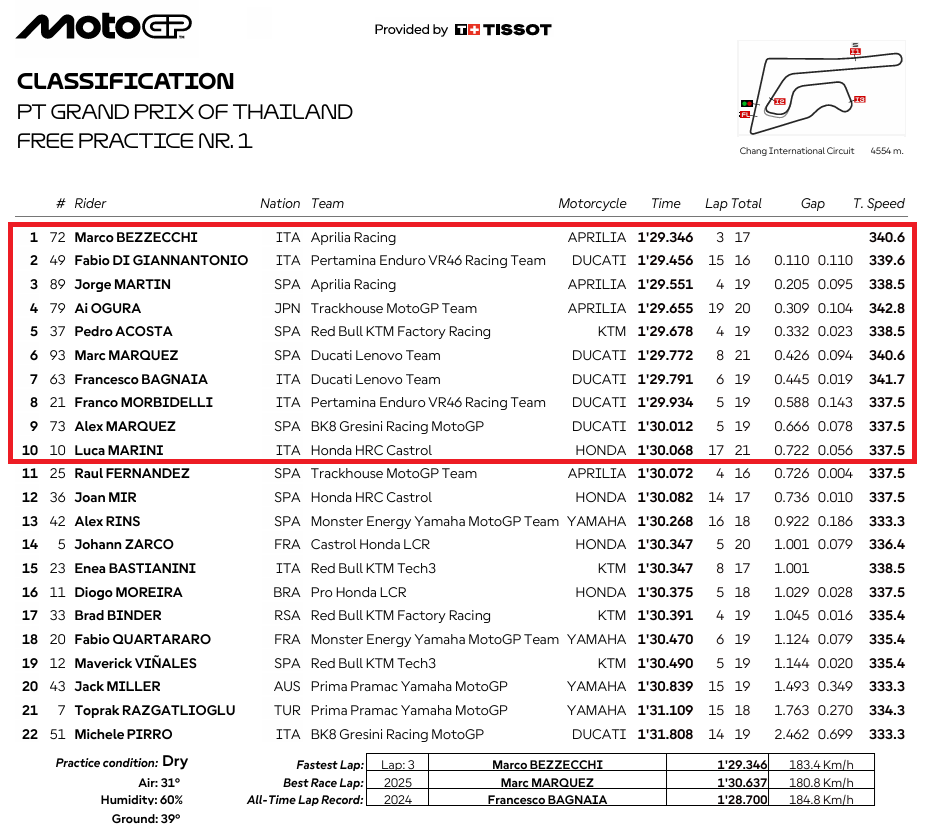 Bezzecchi, con récord, lideró el viernes GP de Tailandia