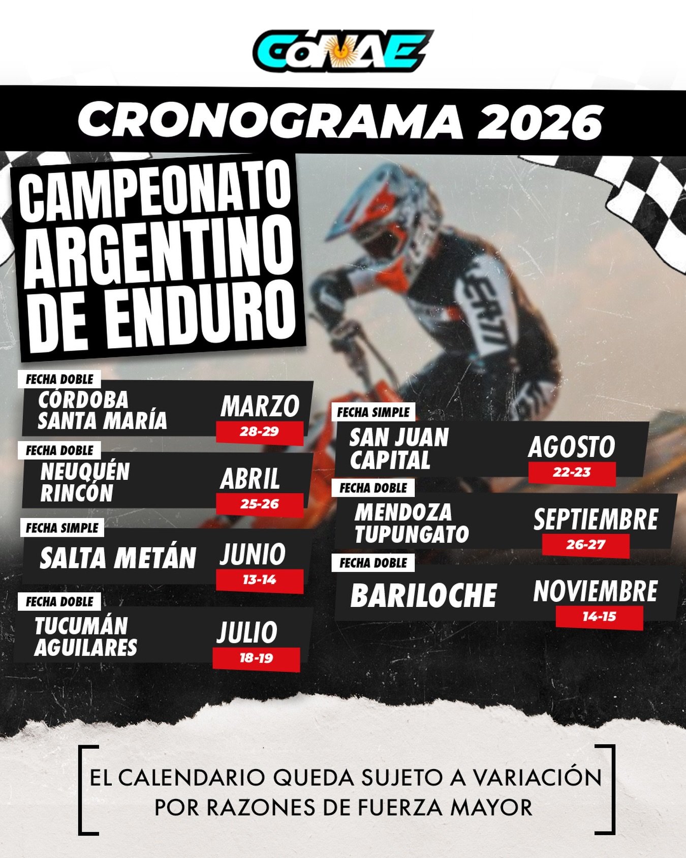 El Campeonato de CONAE tendrá siete fechas (5 dobles) que se iniciará en Santa Maria, Córdoba; el último fin de semana de marzo.