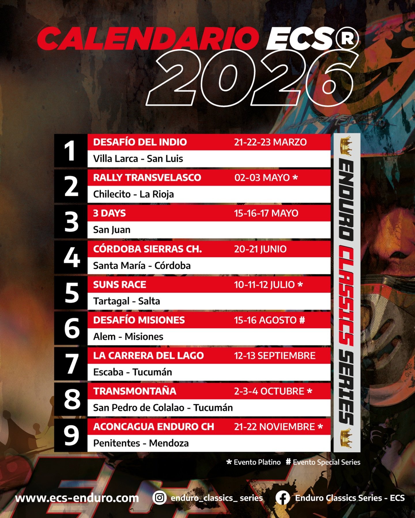 El ECS (Enduro Classic Series) constará de nueve fechas que comenzará del 21 al 23 de marzo con el Desafío del Indio en Villa Larca, San Luis; una semana antes del Argentino de Enduro.