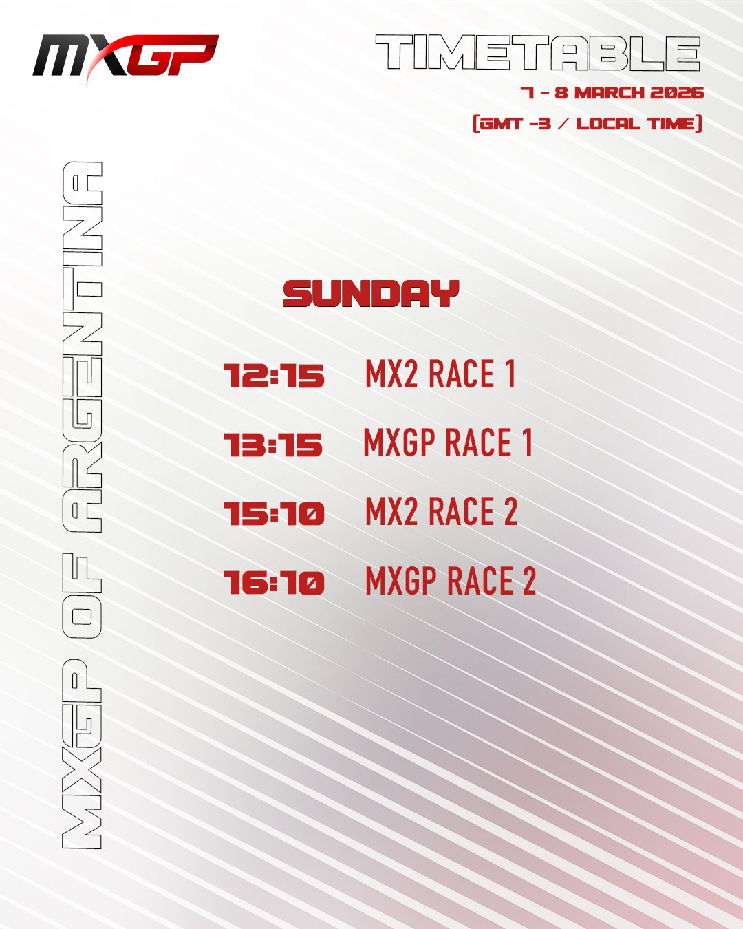 Por su parte, el domingo, la acción en pista comenzará a las 10:25 con el calentamiento. El momento más esperado llegará al mediodía, cuando desde las 12:15 comience la carrera 1 (30 minutos más 2 vueltas) y a partir de las 15 con la carrera 2 (30 minutos más 2 vueltas). En cuanto al viernes 6 de marzo, a las 18, el emblemático Centro Cívico será escenario de la firma oficial de autógrafos del MXGP Argentina YPF, donde los pilotos del Campeonato Mundial de Motocross compartirán un momento único con el público.