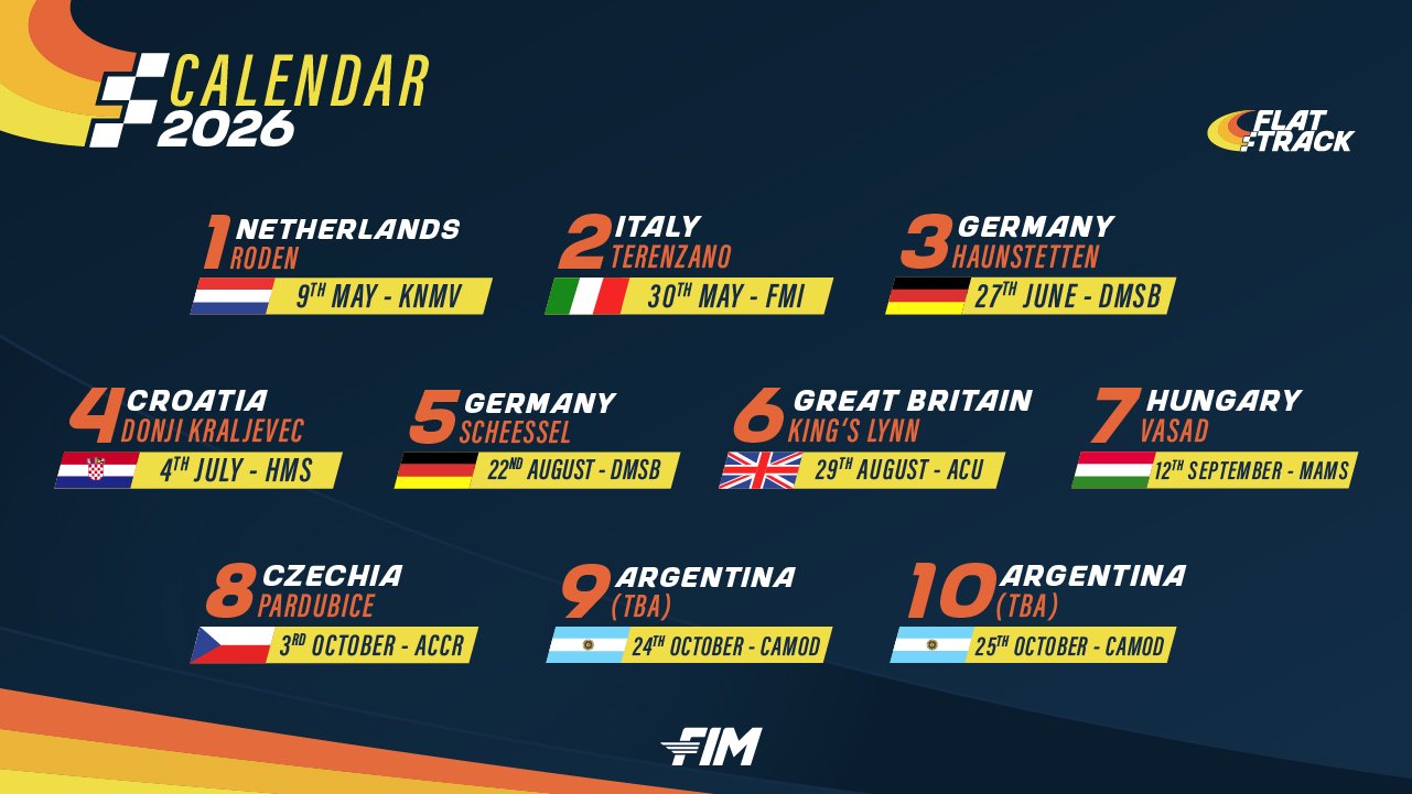 La Edición 2026 del World Championship FIM Flat Track sé correrá en Argentina. Se confirmó el Calendario con 10 fechas (el más extenso de las siete ediciones) y nuestro país tendrá las Rondas 9 y 10 el sábado 24 y domingo 25 de octubre en circuito a definir dentro de la Provincia de Santa Fe.-