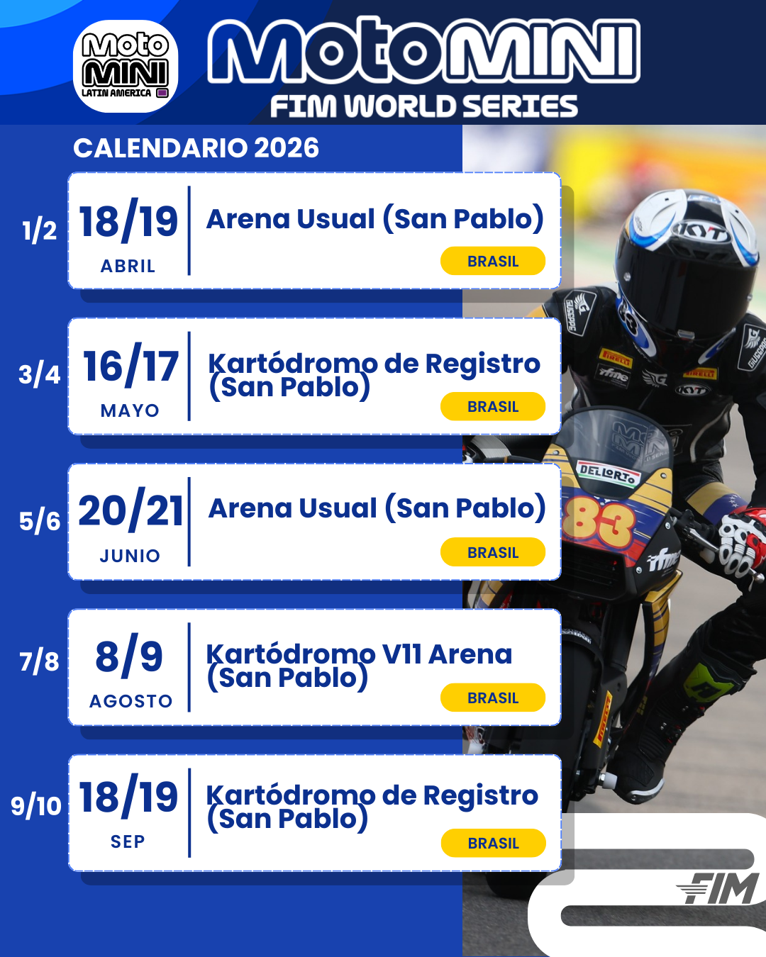 Nuestro continente será parte de la Serie Mundial FIM MotoMini 2026. La Copa Ohvale Brasil pasará ser parte del Mundial junto a la Serie FIM MotoMini de Tailandia. Ambas Series albergarán carreras en la categoría de 160cc.. En el caso de Latinoamerica lo hizo en 2024 en Colombia y ahora se desarrollará en Brasil. En tanto Tailandia se une a la lista por primera vez.