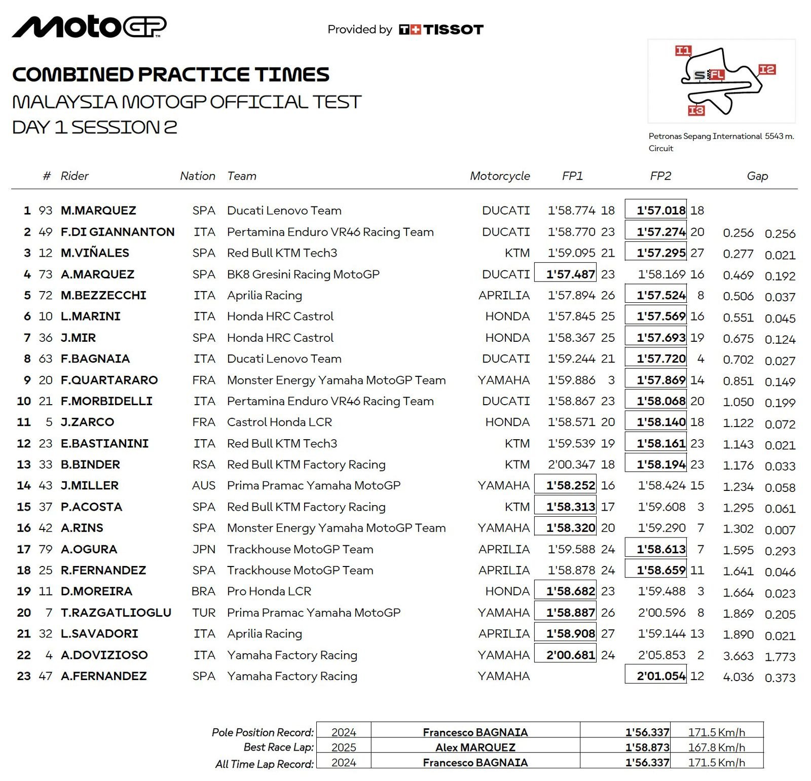 La única Ducati de Gresini en pista, la máquina de Alex Márquez (BK8 Gresini Racing MotoGP), lideró la sesión inicial pero fue el único piloto entre los 13 primeros que no mejoró por la tarde. Cabe destacar que es el ganador más reciente de un Gran Premio en Malasia.