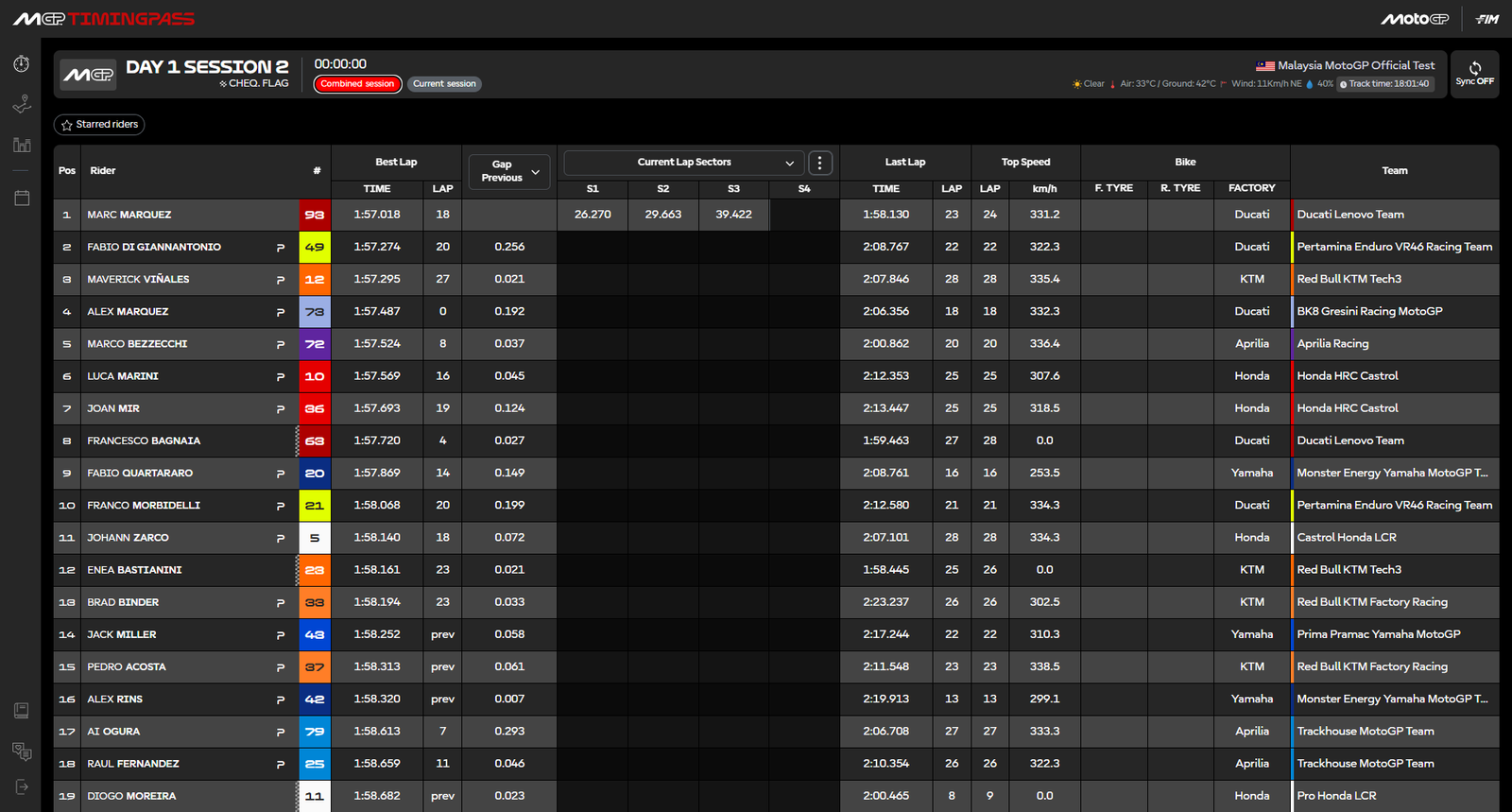 Por otro lado, Davide Tardozzi declaró durante el ‘Midday Live’ que Francesco Bagnaia (Ducati Lenovo Team) es un «nuevo Pecco». Bagnaia terminó 8º, a 0,702s de su compañero. El dos veces Campeón del Mundo de MotoGP se mostró positivo al final del día y apunta a una simulación de carrera para el segundo día.