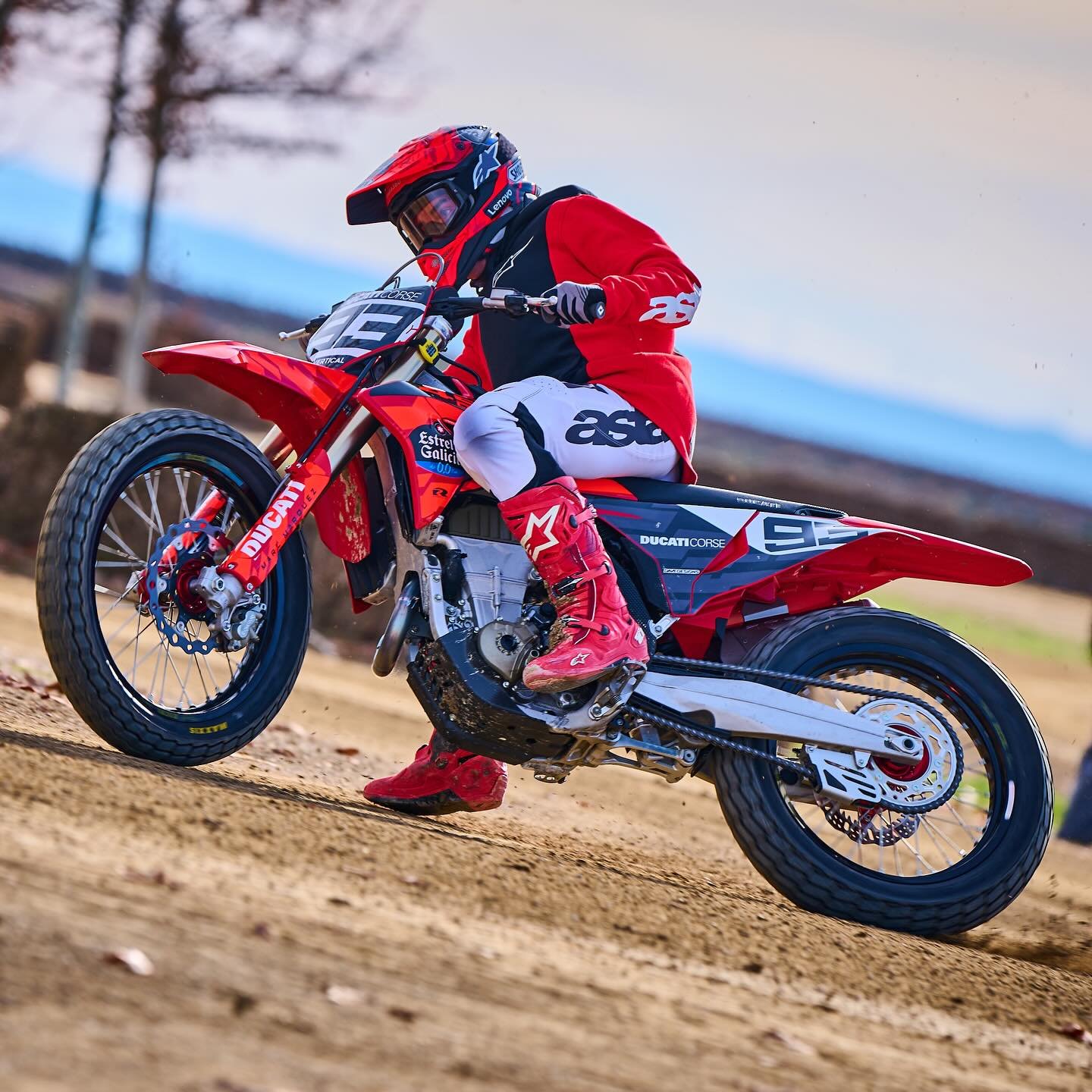 El campeón del mundo de MotoGP estuvo en Alcarras, Cataluña; entrenando en Flat Track junto a su hermano Alex y el brasileño Diogo Moreira. Después de 78 días de ausencias por la lesión del hombro derecho en el accidente con Marco Bezzecchi en el GP de Indonesia, el de Cervera se subió a la Ducati DesmoMX para comenzar a tener contacto con la moto.