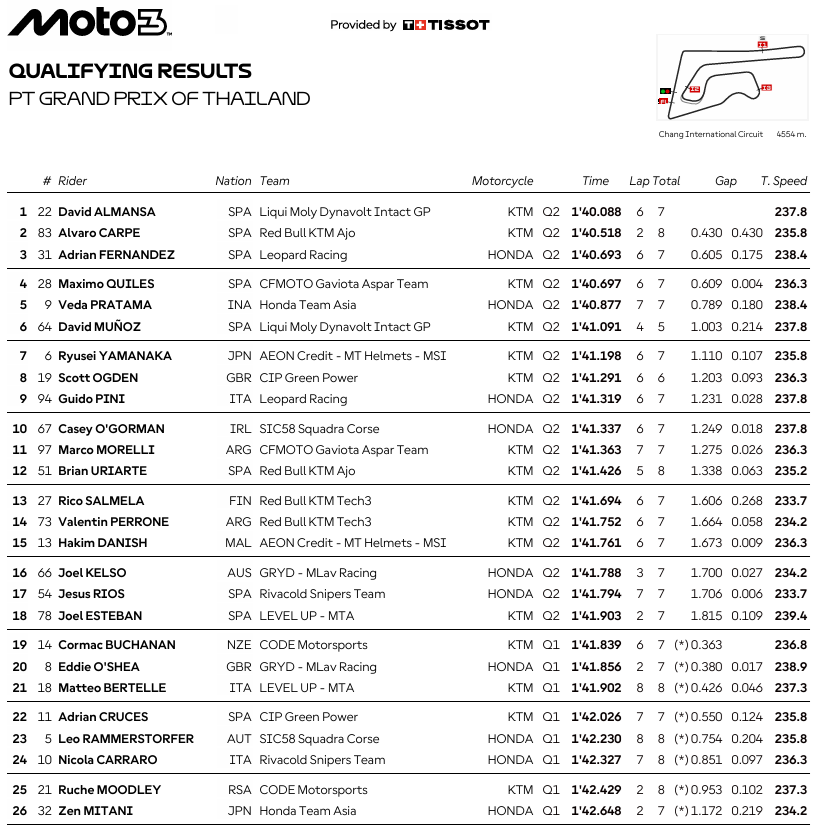 La Q2 fue un auténtico capítulo inesperado. Tras los tres primeros, Máximo Quiles (CFMOTO Aspar Team) se aseguró la cuarta plaza, seguido de Veda Pratama (Honda Team Asia) y David Muñoz (Liqui Moly Dynavolt Intact GP), completando la segunda fila. La tercera línea contará con Ryusei Yamanaka (FRINSA – MT Helmets – MSI), Scott Ogden (CIP Green Power) y Guido Pini (Leopard Racing), mientras que Casey O’Gorman (SIC58 Squadra Corse), Marco Morelli (CFMOTO Aspar Team) y Brian Uriarte (Red Bull KTM Ajo), los rookies de la Categoría.