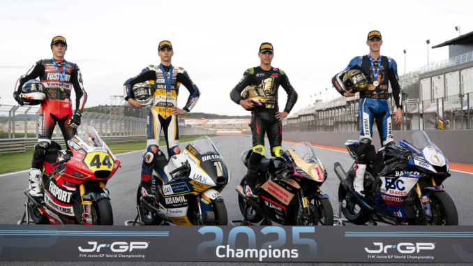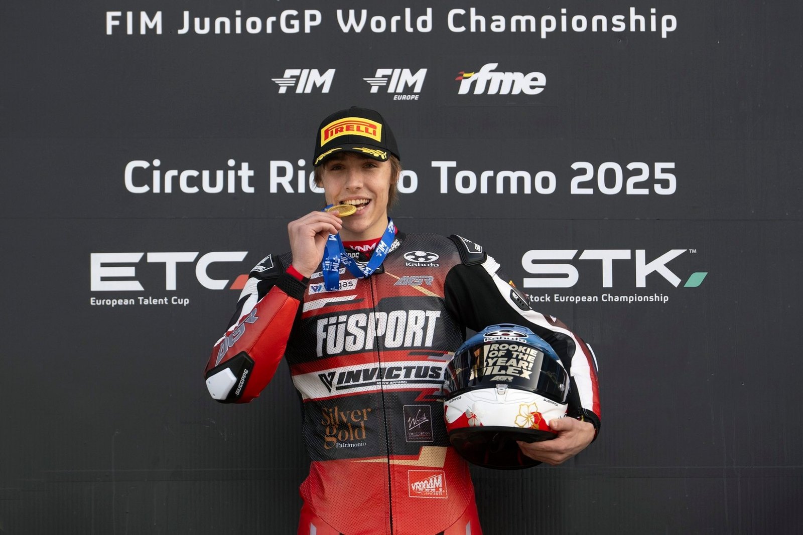 España.- Al título del JuniorGP (Moto3) de Brian Uriarte de España se sumaron los campeones consagrados en la última del año en Valencia. En Moto4 European Cup hizo podio y con el tercer puesto, logró el título Fernando Bujosa. El español estará en 2026 en la Rookies Cup.