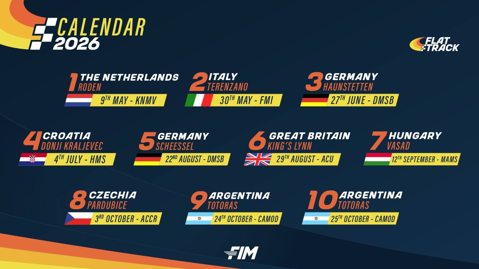 Por primera vez en la historia en Argentina se correrán fechas mundialistas de motociclismo de óvalos y luego de seis ediciones íntegramente en Europa. El Campeonato se iniciará el sábado 9 de mayo en Holanda, se correrá luego en Italia, Alemania, Croacia, nuevamente Alemania, Inglaterra, Hungría, República Checa y finalmente las dos últimas rondas en Argentina.