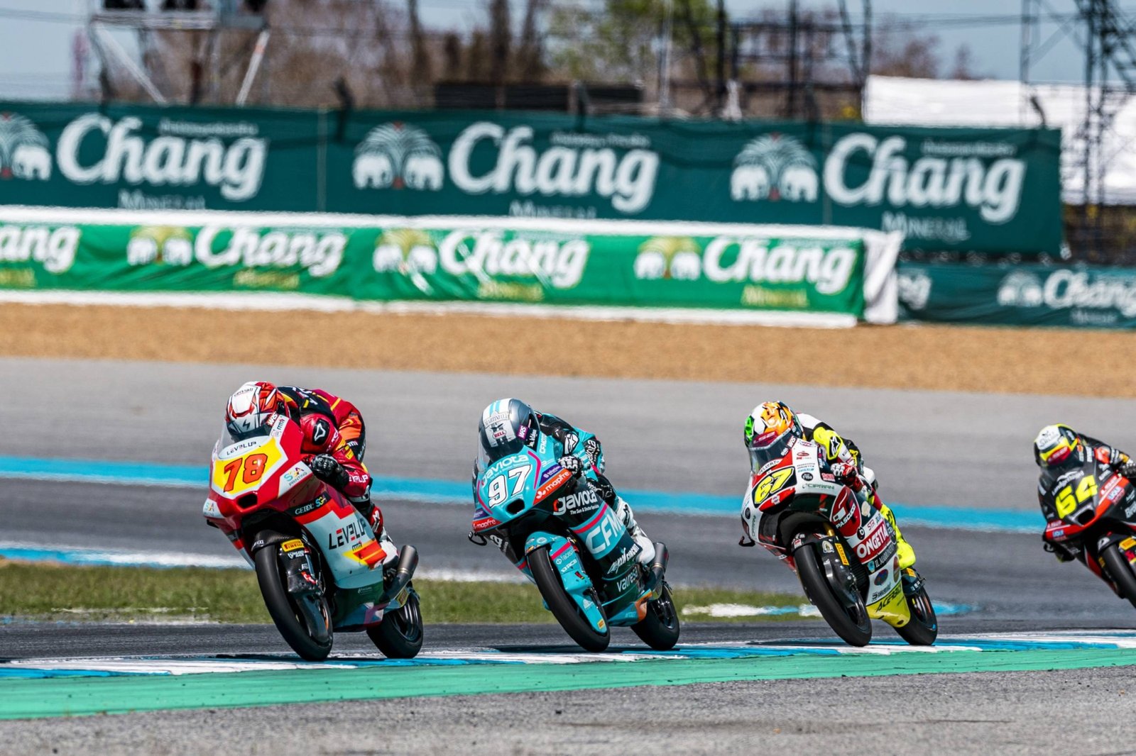 Con David Almansa partiendo desde la ‘pole’, el español supo defender su posición con firmeza desde el primer instante, resistiendo el intenso empuje de Álvaro Carpe (Red Bull KTM Ajo) y Máximo Quiles (CFMOTO Aspar Team), que intentaron cerrarle todos los espacios en los primeros metros.