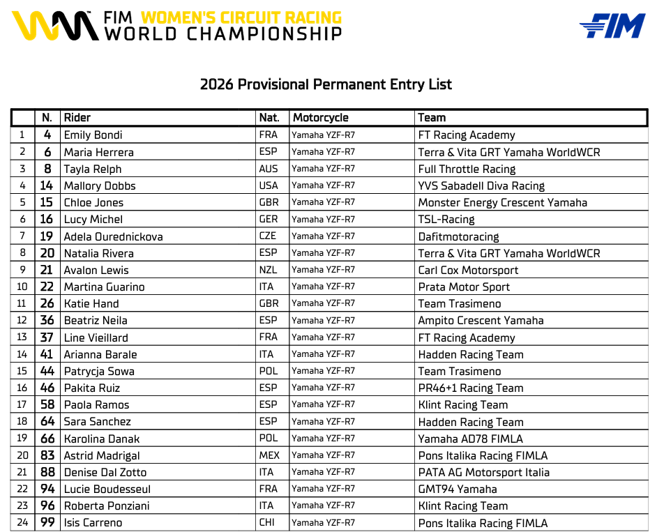 La chilena Isis Carreño Avila y la mexicana Astrid Madrigal seguirán siendo parta del Mundial Femenino de Velocidad. Para la Temporada 2026 ya fueron confirmadas en el Entry List del Calendario. Isis y Astrid continuarán con el Pons Italika Racing FIMLA. Además debutará Karola Danak, integrante del proyecto deportivo de AD78 Academy.